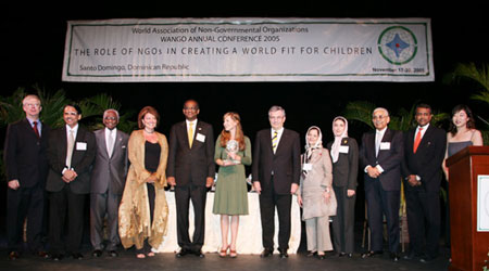 The 2005 WANGO Awards Banquet, held Saturday evening, November 19, at the La Fiesta Theater of the Renaissance Jaragua Hotel, was a highlight of the WANGO Conference. Five awards were presented in the categories of Education, Humanitarian, Society and Health, Peace and Security, and a special award for a Century of Service to Humanity and Society. Prior to the actual presentation of the Award to the recipient, a short film clip was shown of each NGO’s activities. The clips were moving and inspiring, depicting the extraordinary things being achieved with hope, optimism, persistence and patience.